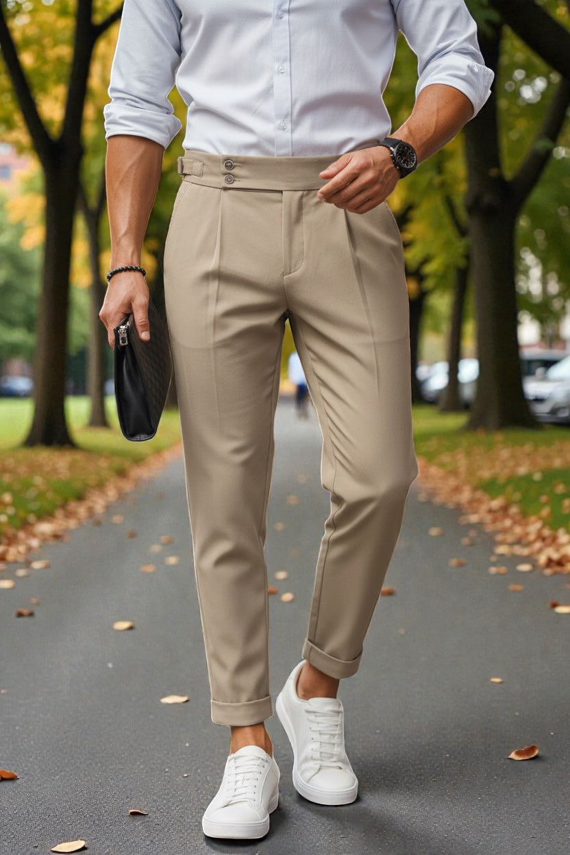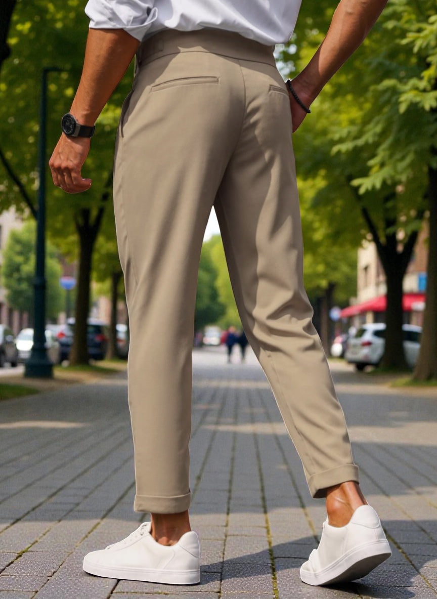 BROADSTAR Men Off White Mid-Rise Slim Fit Gurkha Italian Pants blend sophisticated Italian tailoring with modern Korean minimalism for a refined and premium look. Designed with a sleek slim silhouette and signature Gurkha pleats, these pants add sharp structure and elegance to your outfit. Crafted from premium breathable fabric, they ensure all-day comfort while maintaining a crisp, polished finish. The versatile off-white tone brings a fresh, luxurious appeal, effortlessly elevating Gen-Z street style, smart-casual looks, and everyday fashion with a timeless, trendsetting edge.