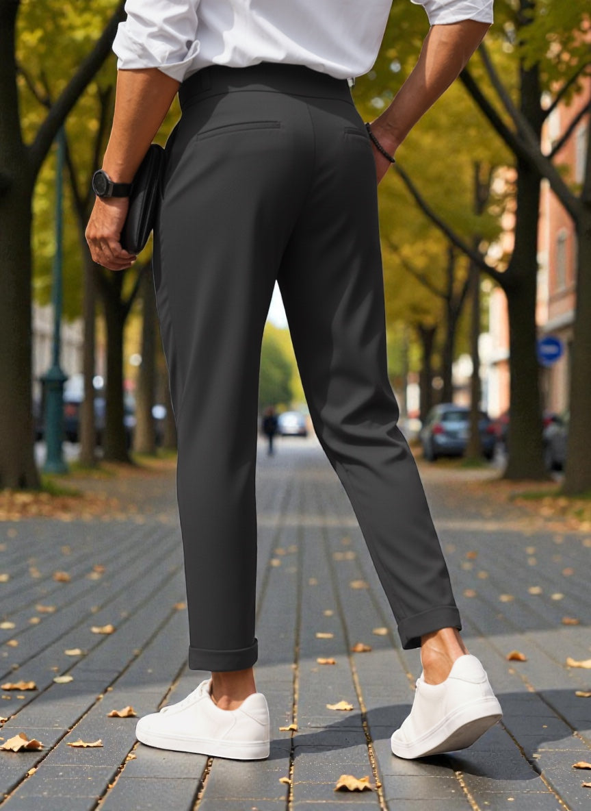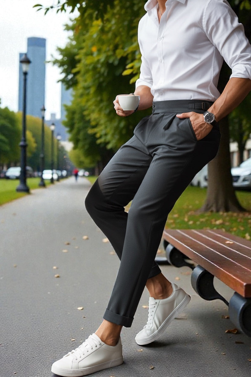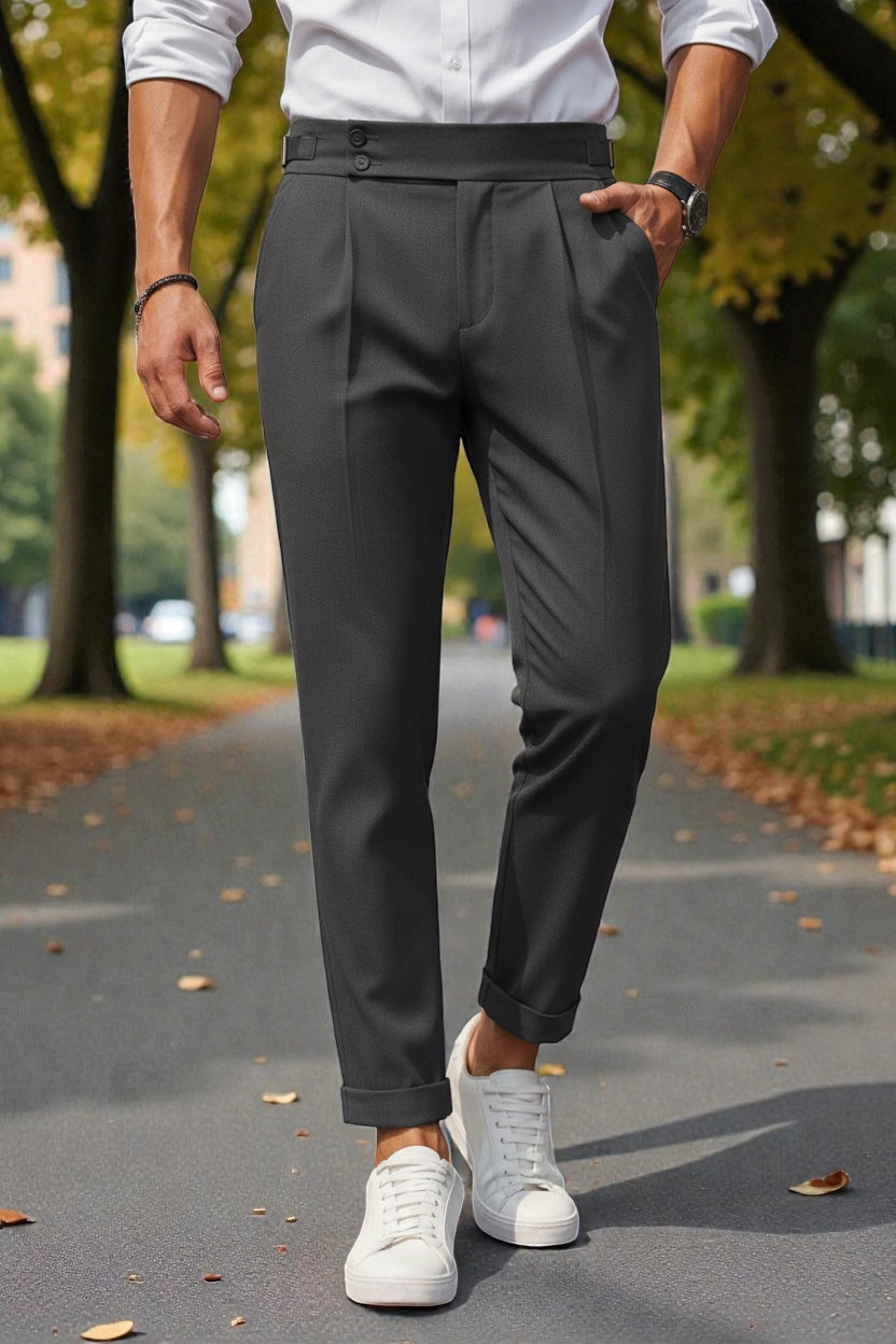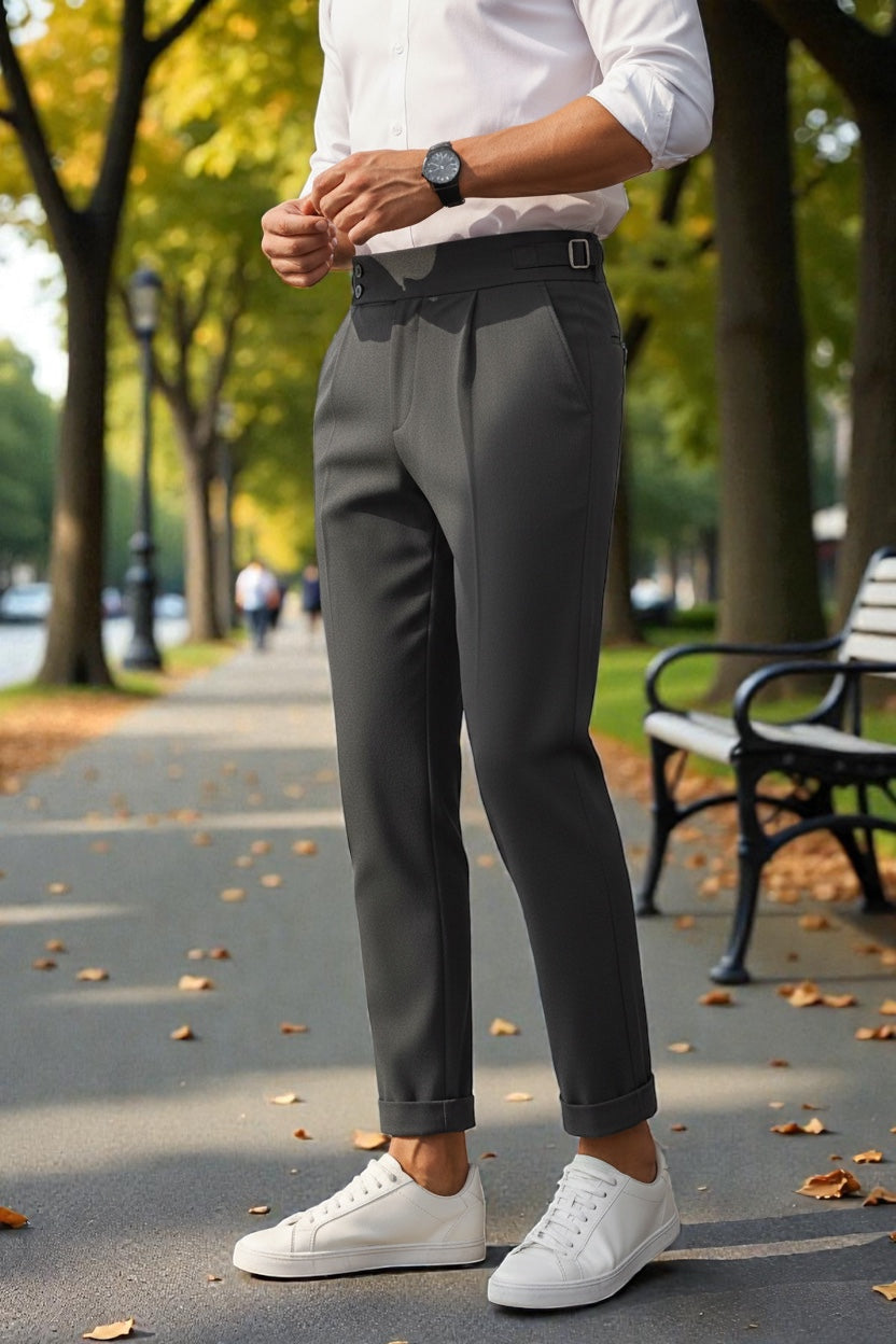 BROADSTAR Men Dark Grey Mid-Rise Slim Fit Gurkha Italian Pants blend sophisticated Italian tailoring with modern Korean minimalism for a sharp and elevated look. Designed with a sleek slim silhouette and signature Gurkha pleats, these pants offer a perfect balance of classic structure and contemporary style. Crafted from premium breathable fabric, they ensure all-day comfort while maintaining a refined, polished finish. The versatile dark grey tone adds a modern, elegant touch, effortlessly enhancing Gen-Z street style, smart-casual looks, and everyday fashion with timeless, trendsetting appeal.